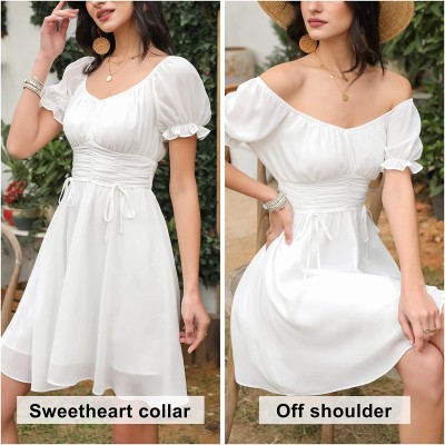EXLURA Women's Summer Dress Short Shirred Ruffled Tank Dress Off-the-shoulder Ruched Flowy Shirred Swing Mini Dress