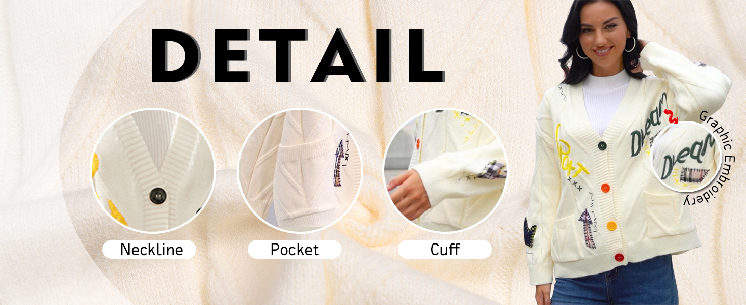 Single-breasted, long sleeves, V-neck, letter pattern, two side pockets, ribbed hem.